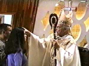L'évêque étend les mains sur la tête des personnes à être confirmées, en invoquant le saint Esprit, et fait une onction sur leur front en disant : " Je te marque du signe de la croix et je te confirme avec le chrême du salut, au nom du Père, du Fils et du saint Esprit. Amen ". |