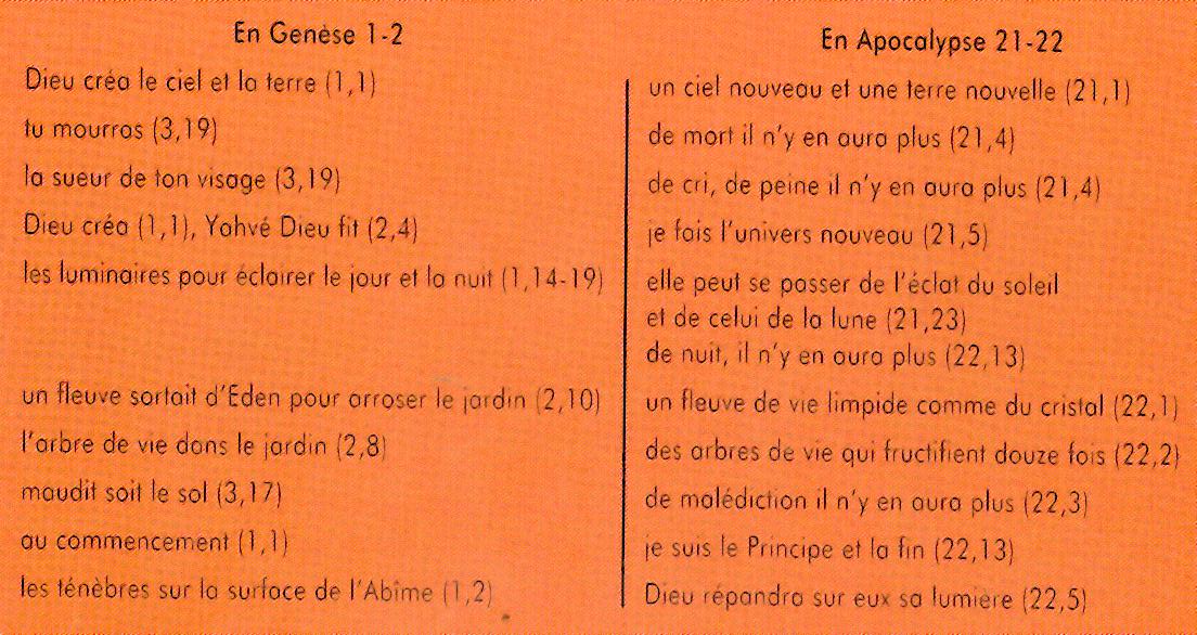 Il arrive donc que le message profond d'un texte échappe à son auteur humain, notamment quand il s'éclaire à la lumière de textes postérieurs. Je vous soumets, à ce sujet, l'exemple suivant où les premières pages de la Bible peuvent être mises en parallèle avec les dernières. Voyez plutôt :
