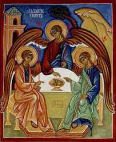 La trinité : Dieu se révèle en tant que Père, Fils et Saint-Esprit. La Trinité est Une: il n'y a pas trois dieux mais un seul Dieu en trois Personnes qui chacune est Dieu. L'Unité divine est Trine: Les Personnes sont distinctes. Ce ne sont pas des attributs ou des masques d'une divinité unique. Les Personnes sont relatives les unes aux autres: Dieu n'est pas un être solitaire mais un Dieu de vie et d'amour (1 Jn 4,8) dans la communion des trois Personnes: Père, Fils et Saint-Esprit.