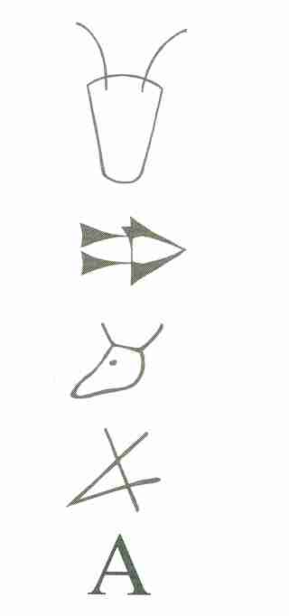 | Ci-dessus : le développement de notre lettre 'A' à partir de la lettre d'origine sumérienne "tête de boeuf". Les étapes jusqu'à nous ont été le cunéiforme akkadien, ensuite, le proto-cananéen, puis le phénicien, et enfin, le grec. |