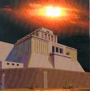 | Reconstitution de la Ziggourat d'Eridu (3000av JC). C'est ce type de Ziggourat qui a inspiré le récit de la Tour de Babel. |
